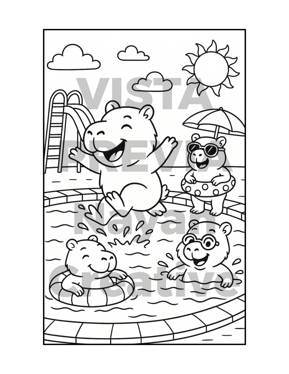 Este libro digital incluye 50 imágenes adorables para colorear con Capibara y sus amigos: elefante, conejo y tortuga. Los encontrarás en divertidas escenas como estudiando, jugando, esquiando y disfrutando en la playa.